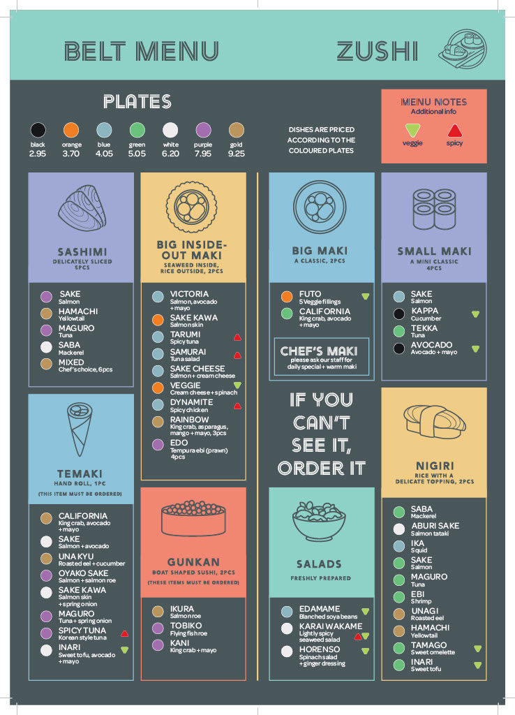 If you would like a take away just choose one of the take away menus or make your own menu directly from the conveyor belt. Due to the preparation time, large orders can be made by telephone in advance of pick up.