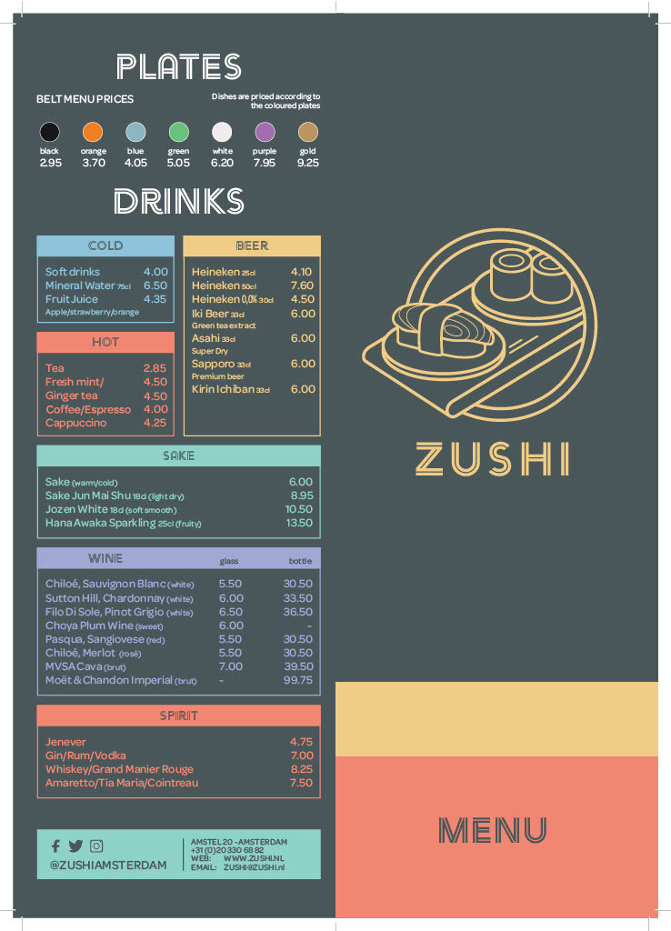 Since 1999 Zushi stands for delicious fresh quality sushi and grilled dishes in a relaxed and friendly atmosphere. Our conveyor belt sushi bar is located in the city centre of Amsterdam, in a beautiful 19th-century building that offers a beautiful view over the Amstel River. You will find a complete assortment of various sushi and warm dishes that are made with only the finest ingredients: premium beef and chicken, fresh sustainable seafood with the MSC or ASC label and hand-cut fruit and vegetables.